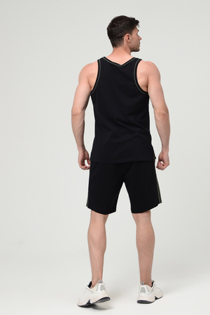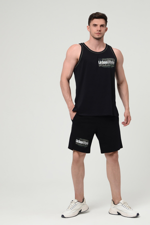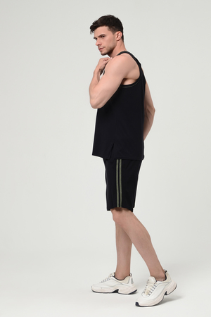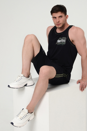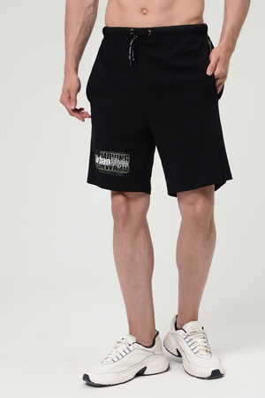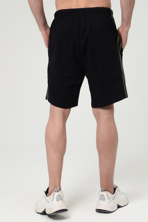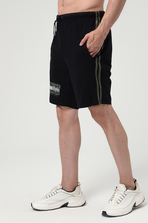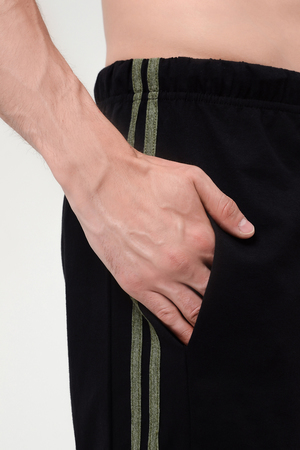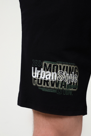 Мужские шорты выше колена. Пояс - резинка со шнурком, по бокам карманы и настроченные лампасы. С одной стороны печать