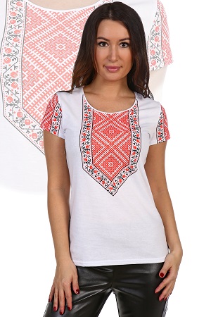 Футболка из кулирки для девушек. Узор в виде народных вышивных мотивов