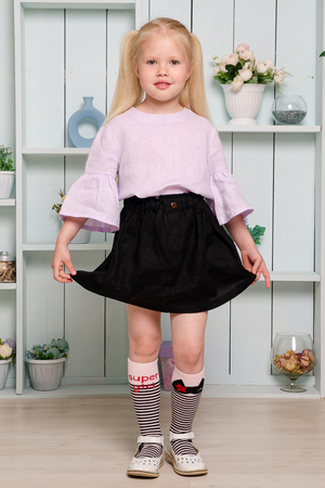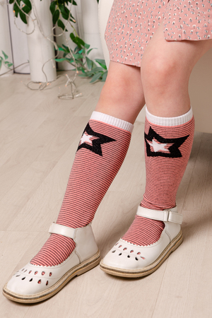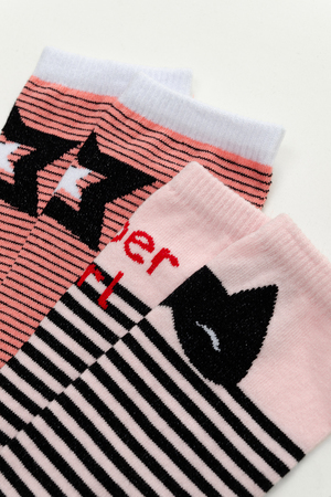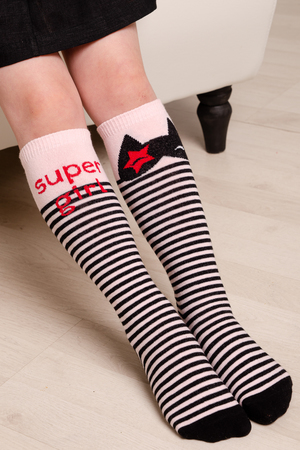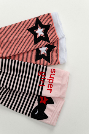 Яркие гольфы в полоску для девочек. Одна пара в тонкую полоску, спереди вывязана черная звезда. Вторая пара в широкую полоску, с надписью Super girl и черной маской. В упаковке 2 пары - по одной паре каждого вида.
