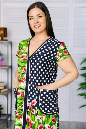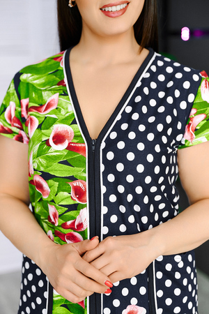 Халат женский на молнии из натурального хлопка, V-образный вырез горловины, средней длины, приятный к телу, комфортный. Выполнен из кулирки, с двумя карманами, с поясом.