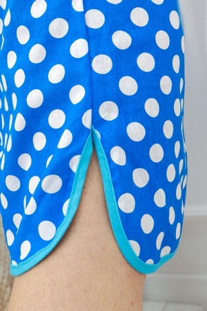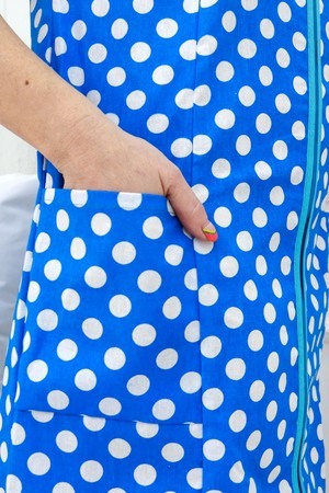 Халат из бязи на молнии. Полочки с рельефами и карманами. Спинка цельнокройная. Все края изделия обработаны окантовкой из бязи. Длина халата средняя. Цвета в ассортименте