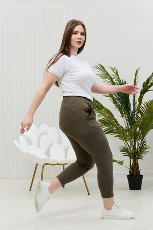 Брюки женские, свободные по бедрам, зауженные к низу. На передних частях брюк внутренние карманы. На задних частях брюк фигурные рельефы, переходящие в боковой шов.