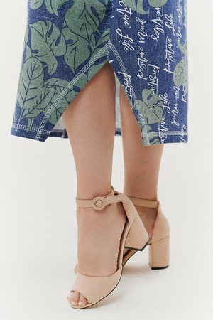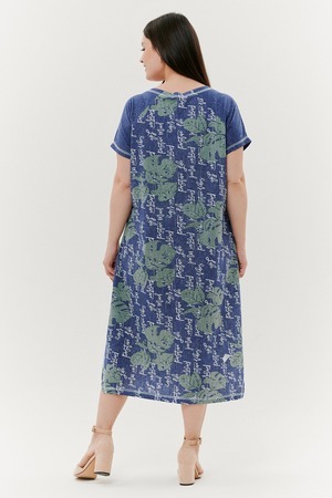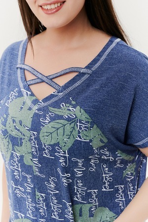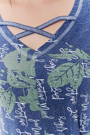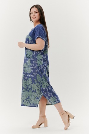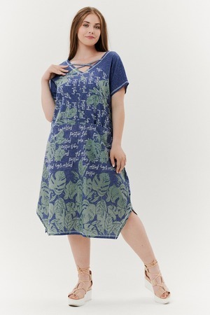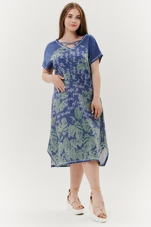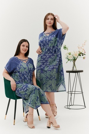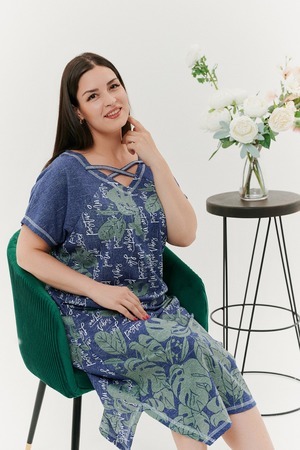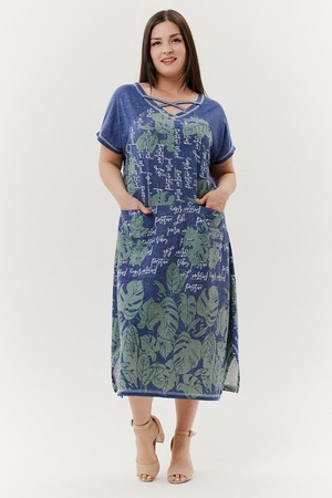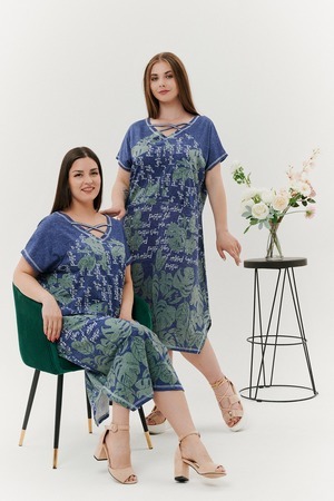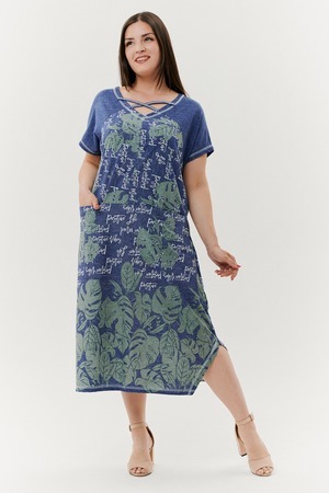 Платье женское, расширенное к низу. Рукав реглан, короткий. На Y-образной горловине два пересекающихся хляста из окантовки. В шве притачивания верхней и нижней частей полочки внутренние горизонтальные карманы. Боковые швы внизу платья срезаны под углом.