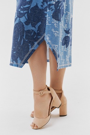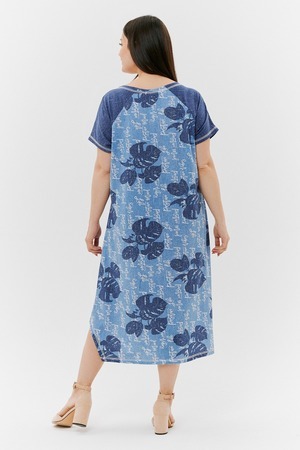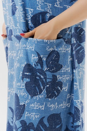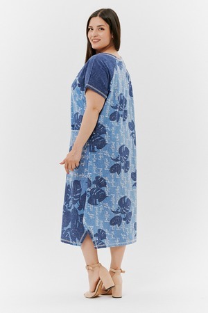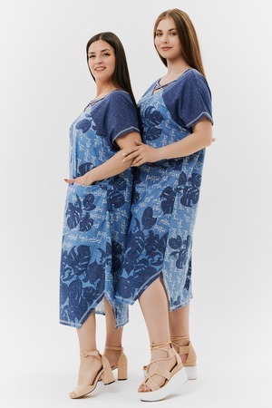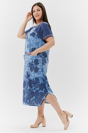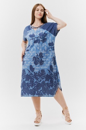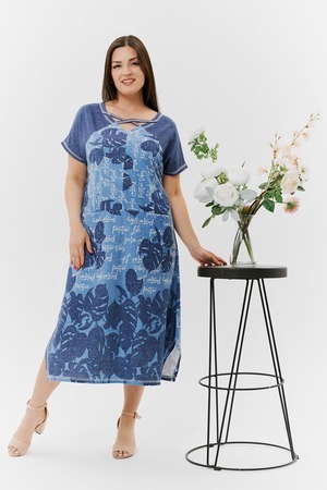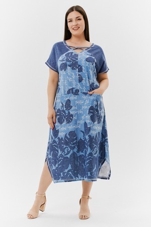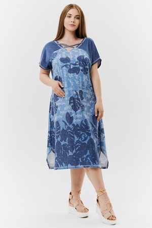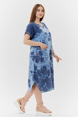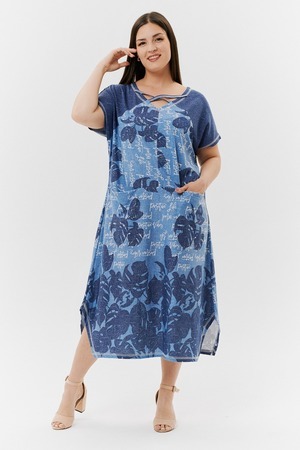 Платье женское, расширенное к низу. Рукав реглан, короткий. На Y-образной горловине два пересекающихся хляста из окантовки. В шве притачивания верхней и нижней частей полочки внутренние горизонтальные карманы. Боковые швы внизу платья срезаны под углом.