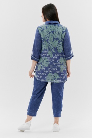 Туника женская прямого силуэта с отложным воротником. Застежка на петли-пуговицы. Рукав втачной, длина 3/4 с манжетой и хлястом. Низ туники фигурный, спинка несколько длиннее полочки. На полочке нагрудный карман.