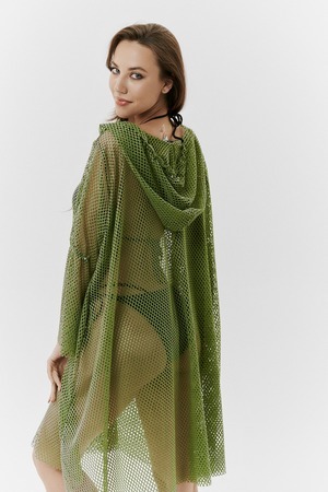 Туника женская пляжная, свободного силуэта с капюшоном и длинным рукавом. Декорирована хольнитенами.