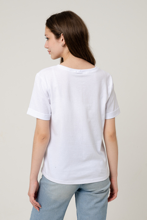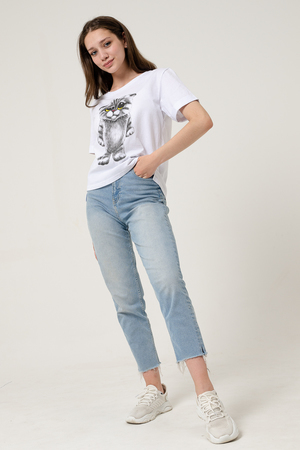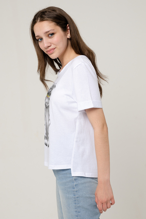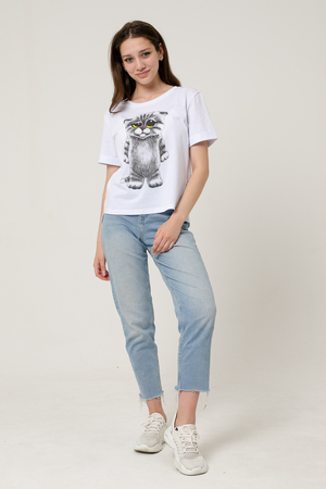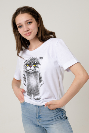 Футболка прямого силуэта, с округлой горловиной, с фигурной линией низа, длиной до середины бедра. Рукав втачной, короткий, с отворотом. Горловина обработана обтачкой из эластичного полотна. В продаже есть аналогичная детская футболка 5125