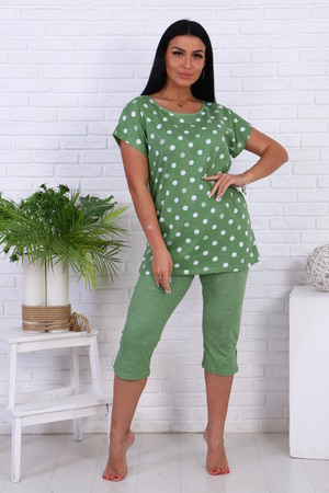 Женский костюм с бриджами из кулирки. Футболка свободного кроя, с короткими спущенными рукавами. Горловина выполнена в форме лодочки, отделана кантом. Бриджи на резинке до середины икр, по бокам разрезы.