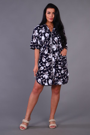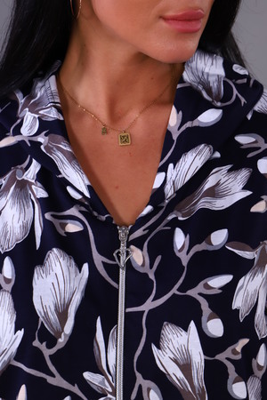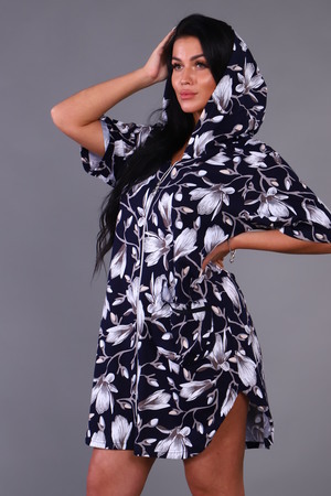 Туника женская на молнии, с капюшоном. Полочка с одним декоративным карманом, низ изделия по бокам фигурный. Вход кармана украшен репсовой лентой. Рукав до локтя.