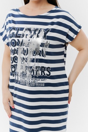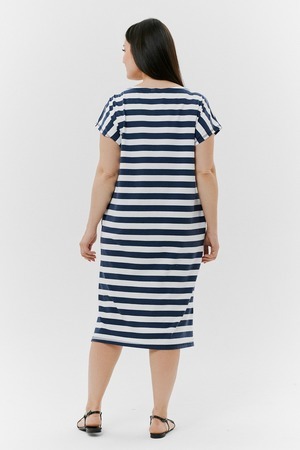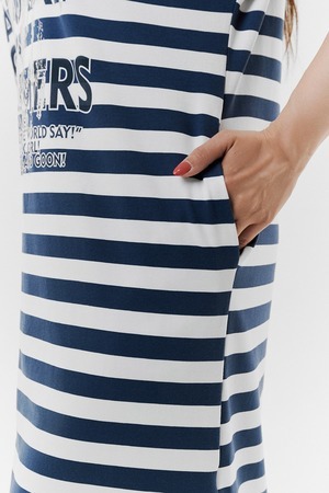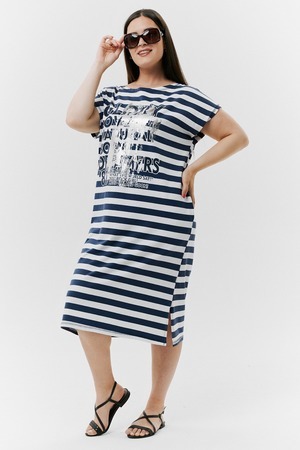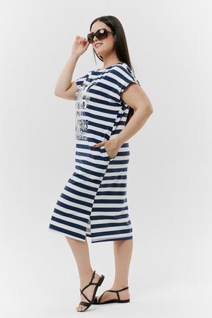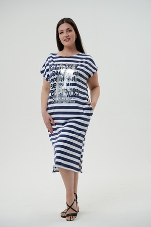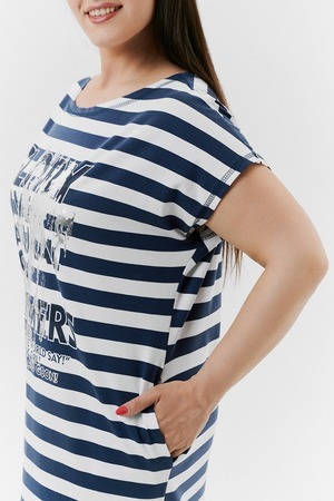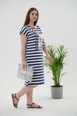 Платье женское прямого силуэта. Рукав цельнокроенный короткий. В боковых швах внутренние карманы, внизу разрезы. На полочке принт. Это платье - бестселлер, благодаря популярной  ткани в полоску, особенно в летний период.