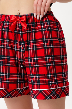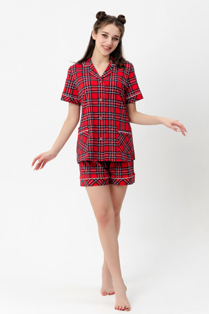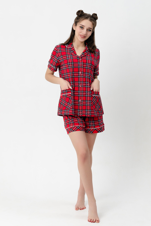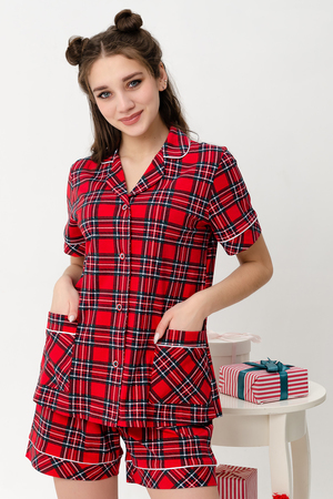 Пижамный костюм из 100% хлопка, состоит из рубашки и шорт. Рубашка на пуговицах с декоративной отделкой. Шорты прямые верх на поясе с резинкой, декоративный бантик на поясе. Трикотажное полотно, из которого выполнена пижама, не стеснит ваших движений и позволит вашей коже дышать. Данная модель отлично подойдет не только для сна, но и в качестве стильного домашнего костюма.