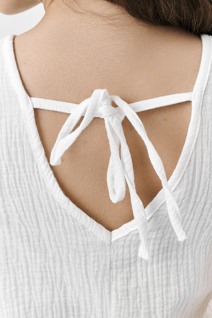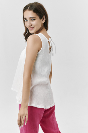 Майка трапецивидного силуэта средней длины, с округлой горловиной, без рукавов, с удлиненной спинкой. На кокетках полочки расположены декоративные люверсы. Горловина и проймы обработаны бейкой из основного полотна.