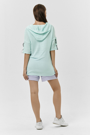 Туника прямая, свободная, с капюшоном, с удлиненной спинкой. Рукав короткий, с декоративными элементами вдоль рукава. В нижней части боковых швов обработаны разрезы.