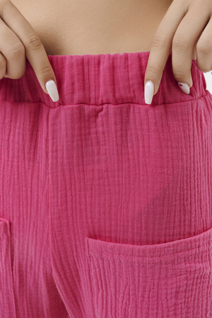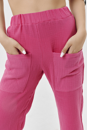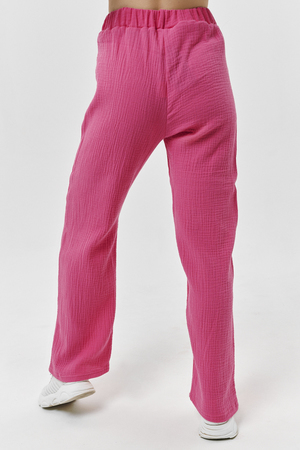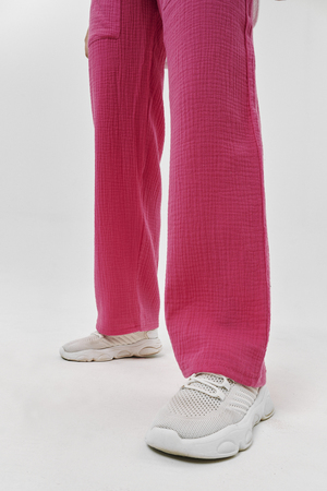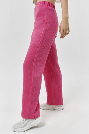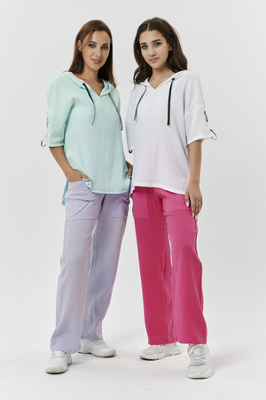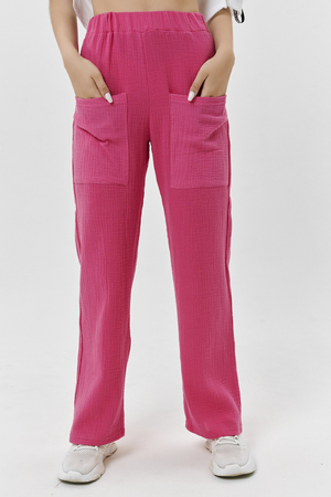 Брюки свободные, прямые, с накладными карманами, на поясе.
