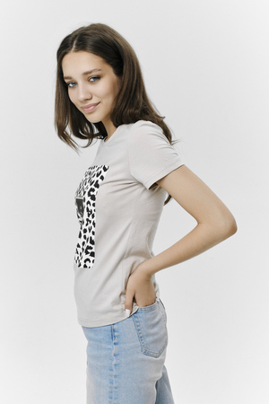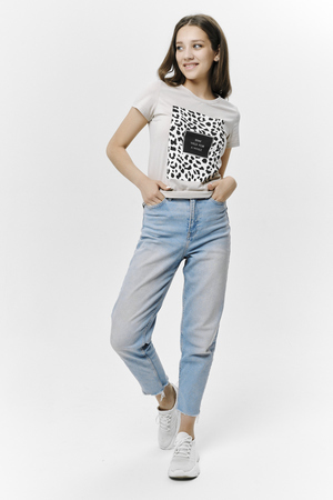 Футболка прямого силуэта, с округлой горловиной, длиной до середины бедра. Рукав втачной, короткий. Горловина обработана обтачкой из основного полотна.