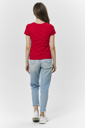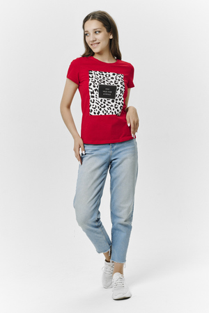 Футболка прямого силуэта, с округлой горловиной, длиной до середины бедра. Рукав втачной, короткий. Горловина обработана обтачкой из основного полотна.