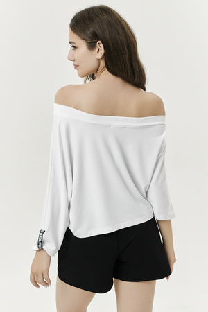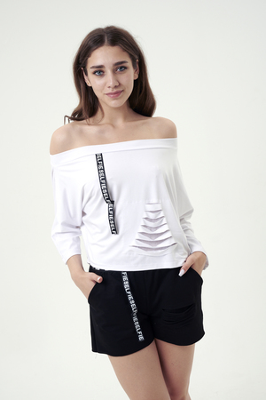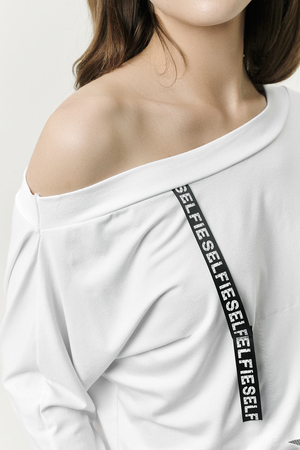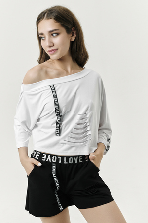 Футболка женская свободного покроя, укороченная, с отделочной тесьмой на рукаве и горловине.
