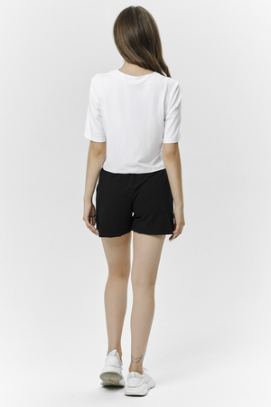 Футболка женская укороченная, свободного силуэта с коротким рукавом, полочка оформлена декоративным элементом: люверсами со шнурком.