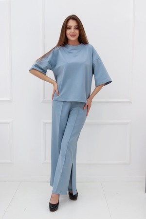 Элегантный свободный костюм с прямыми брюками. Идеальный вариант для прогулок, офиса и посещения торжественных мероприятий. Стрелки и разрез добавляют утонченности образу. Костюм идеально сочетается как с туфлями на каблуке, так и с кроссовками. Свободный силуэт придаст вам шарм и невероятную женственность, скроет недостатки и подчеркнет достоинства.