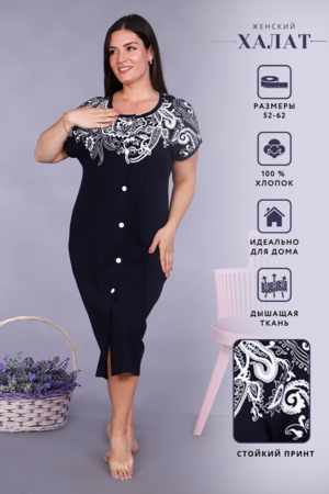 Халат женский из кулирного полотна, прямой силуэт, спущенное плечо, в боковых швах внутренние карманы, застежка на петли-пуговицы, низ изделия обработан на плоскошовной машине, на полочке принт. Благодаря натуральному составу вам будет комфортно и уютно. Халат выполнен по эксклюзивному лекалу. Это модель прекрасно подходит для дома, дачи, отдыха. Оригинальный принт выглядит модно и современно.