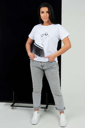 Базовая хлопковая футболка правильной длины. Её можно заправлять или носить на выпуск. Модель имеет свободную посадку и короткий рукав. Изюминка футболки - изображение феи, декоративный элемент - сетка с кружевом.
