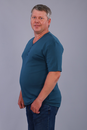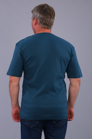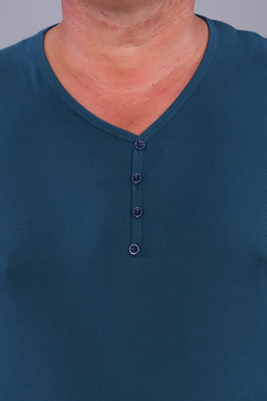 Футболка прямого силуэта. Горловина декорирована треугольным вырезом со вставкой, украшена печатью и пуговицами.