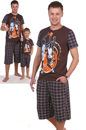 Костюм мужской из кулирки футболка + шорты. Футболка с клетчатыми рукавами и окантовкой горловины, спереди баскетбольный принт. Клетчатые шорты с карманами, длина чуть ниже коленей. Может быть парой детскому костюму Матч (продается отдельно)