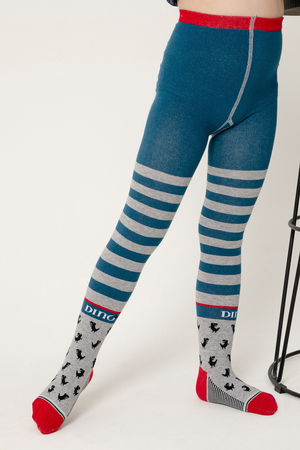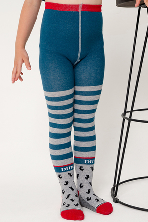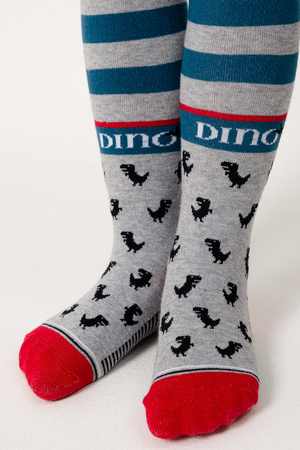 Оригинальные детские колготки. На задней части рисунок динозаврика и надпись HELLO, на ножках рисунки динозавров и полосы.