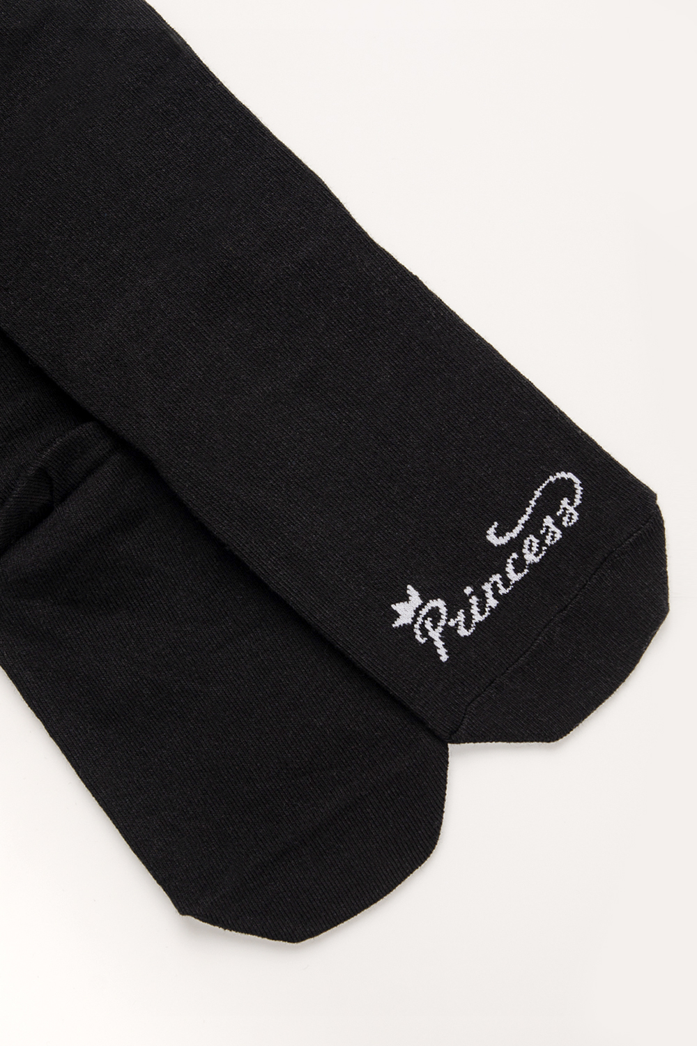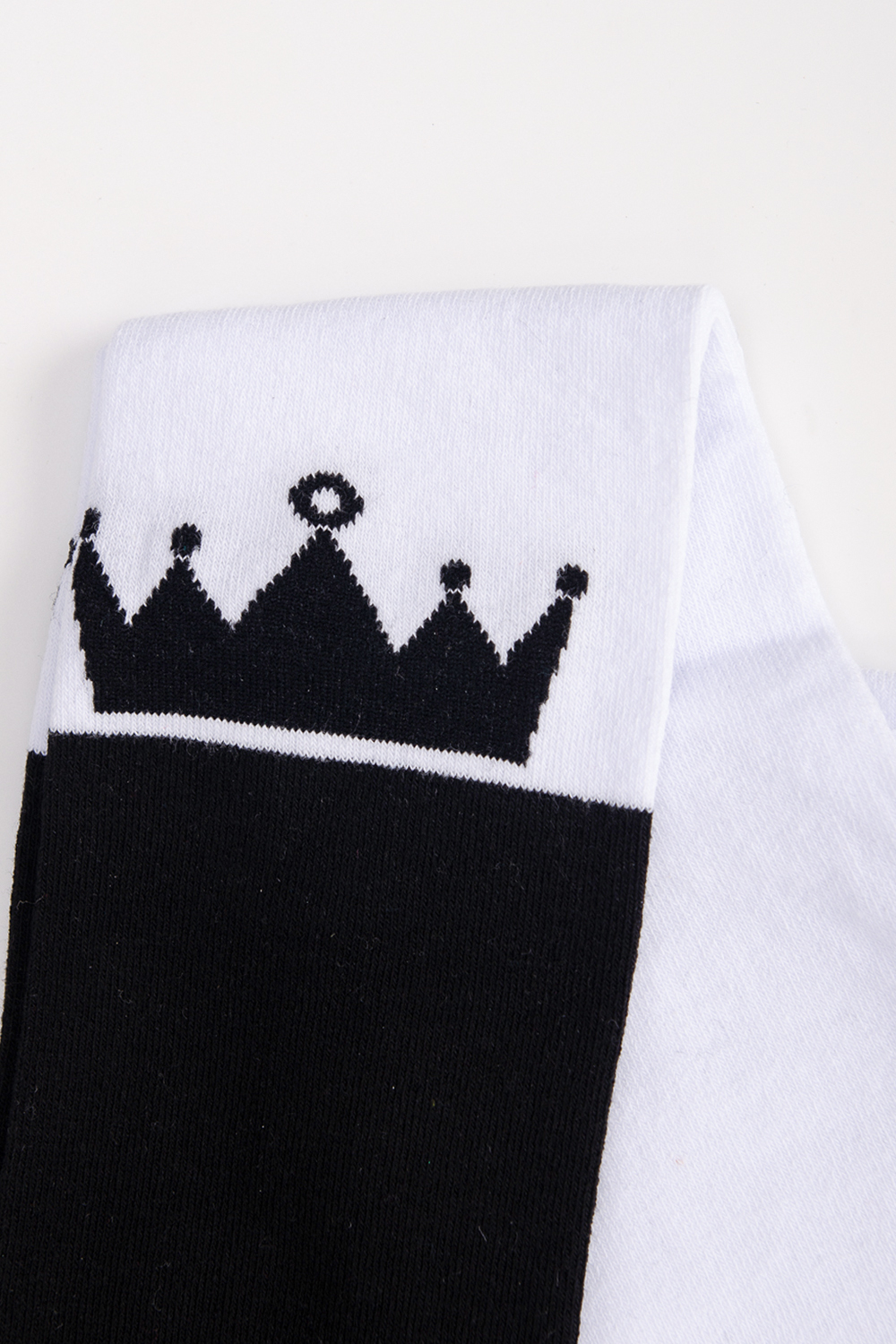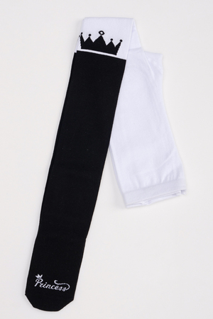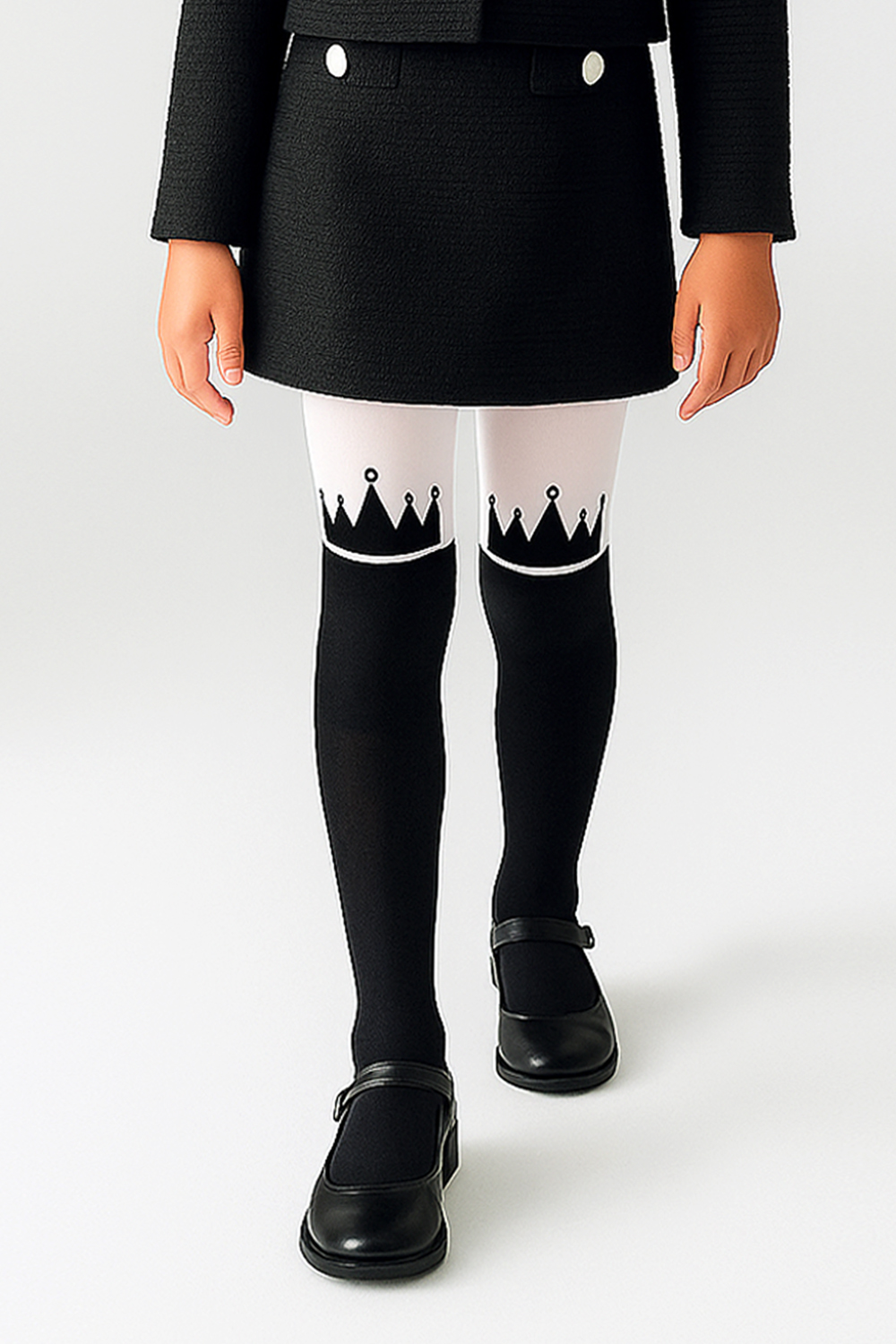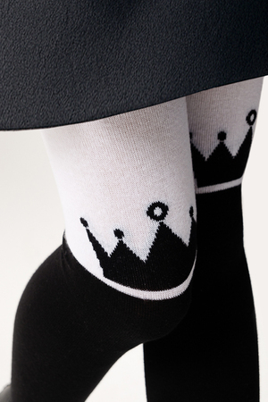 Двухцветные колготки для девочек. Низ колгот черный, верх белый или серый. Чуть выше колена вязаный рисунок короны.