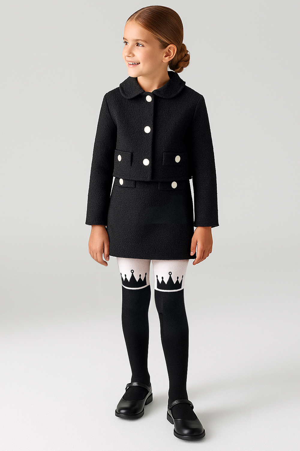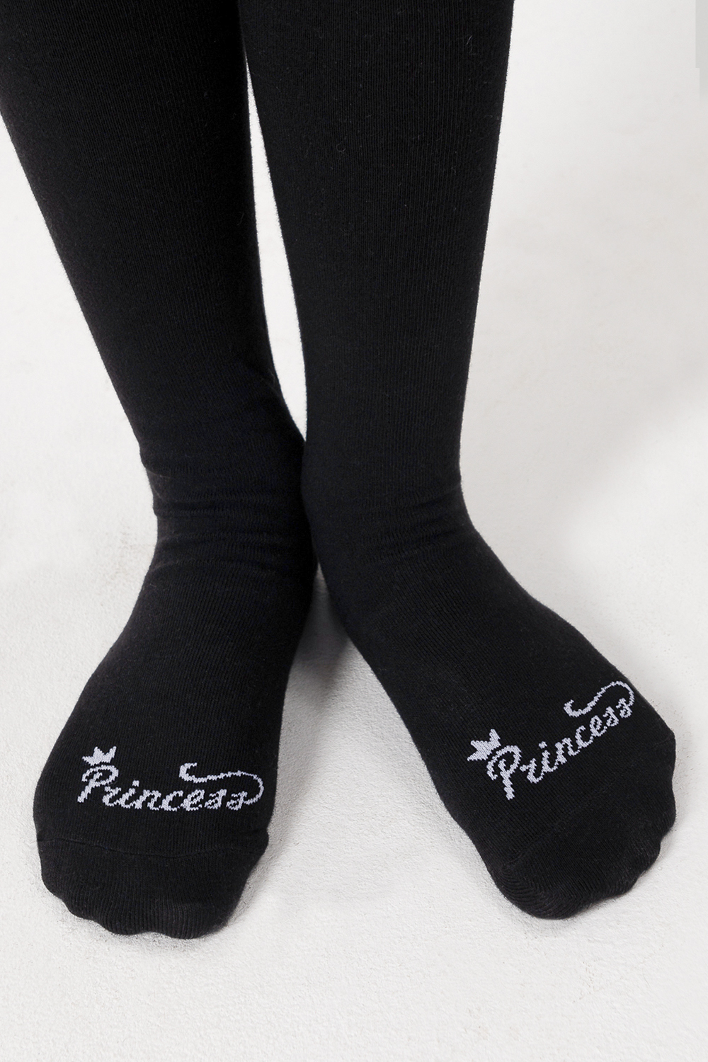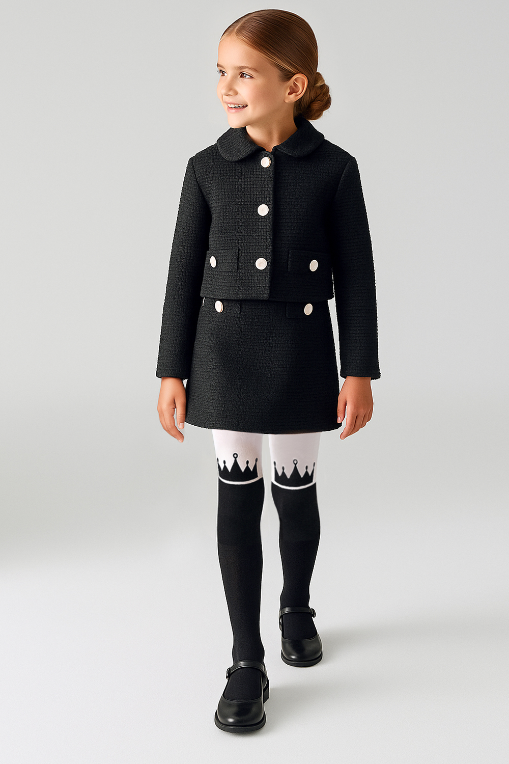 Двухцветные колготки для девочек. Низ колгот черный, верх белый или серый. Чуть выше колена вязаный рисунок короны.