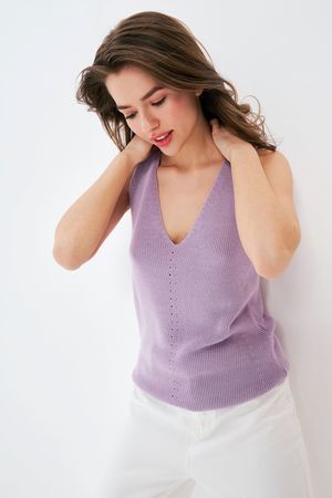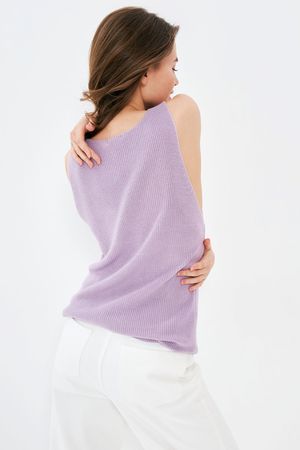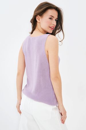 Топ полуприлегающий, переплетение полуфанг со сбавками. Спинка без сбавок, V-образная горловина, оформление - чистый край.