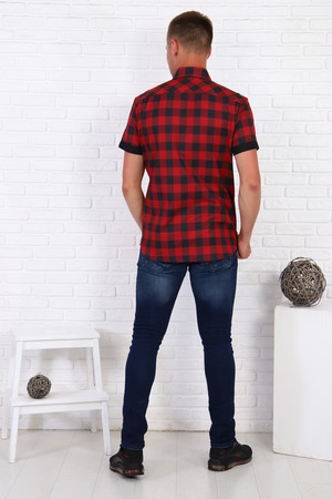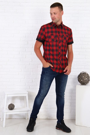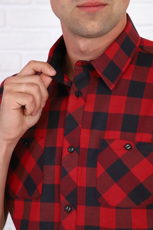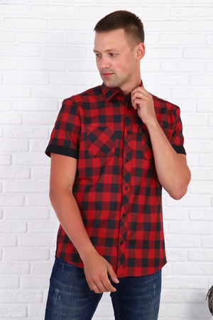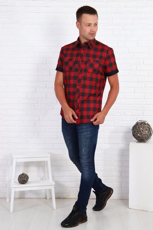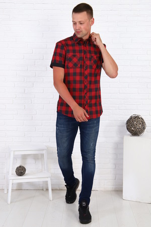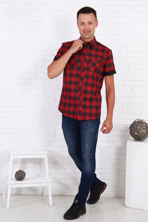 Рубашка мужская с черно-красной клеткой, рукав короткий с манжетом, на груди 2 кармана с пуговицами, низ рубашки овальный.