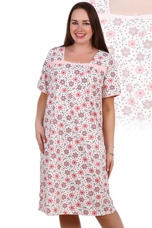 Женская сорочка из кулирки. Квадратный вырез, короткие рукава, две расцветки — пудра и розы, декоративный бантик, общая длина сорочки чуть ниже коленей. Размеры от 52 до 70. Имеется возможность заказать данный товар по розничной цене.
