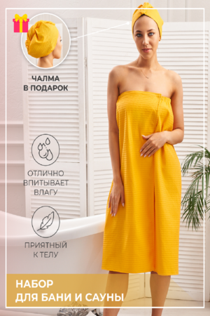 Ну кто не любит попариться в настоящей бане, или насладиться отдыхом и спа-процедурами? Если вы частая посетительница саун и бань, то вам непременно необходим этот великолепный килт банный женский. Этот набор банный заменит все для бани и сауны, при этом в комплект входит стильная чалма в подарок. Этот килт и тюрбан будут служить как халат и банная одежда для женщин, для детей и для девочек, как полотенце банное на резинке и даже как парео для пляжа. Текстиль банный вафельный - это чистый хлопок, вафельное полотно высокой плотности 240 г/м2 прекрасно впитывает влагу. Поэтому вафельные килты на резинке намного лучше впитывают влагу, чем махровый халат или полотенце и при этом он намного компактнее и занимает немного места. Килт вафельный размером 90х150 см идеально и надежно держится по фигуре. Комфортные и удобные накидка и шапочка станут вашим незаменимым спутником в бане, сауне, спа-салоне и просто в душевой спортивного клуба.