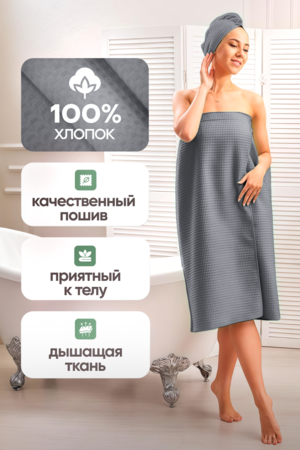 Ну кто не любит попариться в настоящей бане, или насладиться отдыхом и спа-процедурами? Если вы частая посетительница саун и бань, то вам непременно необходим этот великолепный килт банный женский. Этот набор банный заменит все для бани и сауны, при этом в комплект входит стильная чалма в подарок. Этот килт и тюрбан будут служить как халат и банная одежда для женщин, для детей и для девочек, как полотенце банное на резинке и даже как парео для пляжа. Текстиль банный вафельный - это чистый хлопок, вафельное полотно высокой плотности 240 г/м2 прекрасно впитывает влагу. Поэтому вафельные килты на резинке намного лучше впитывают влагу, чем махровый халат или полотенце и при этом он намного компактнее и занимает немного места. Килт вафельный размером 90х150 см идеально и надежно держится по фигуре. Комфортные и удобные накидка и шапочка станут вашим незаменимым спутником в бане, сауне, спа-салоне и просто в душевой спортивного клуба.