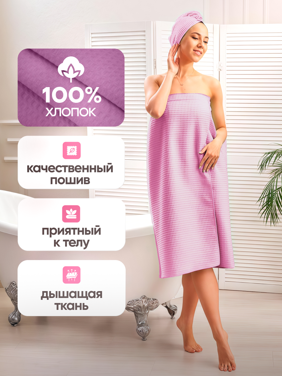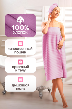 Ну кто не любит попариться в настоящей бане, или насладиться отдыхом и спа-процедурами? Если вы частая посетительница саун и бань, то вам непременно необходим этот великолепный килт банный женский. Этот набор банный заменит все для бани и сауны, при этом в комплект входит стильная чалма в подарок. Этот килт и тюрбан будут служить как халат и банная одежда для женщин, для детей и для девочек, как полотенце банное на резинке и даже как парео для пляжа. Текстиль банный вафельный - это чистый хлопок, вафельное полотно высокой плотности 240 г/м2 прекрасно впитывает влагу. Поэтому вафельные килты на резинке намного лучше впитывают влагу, чем махровый халат или полотенце и при этом он намного компактнее и занимает немного места. Килт вафельный размером 90х150 см идеально и надежно держится по фигуре. Комфортные и удобные накидка и шапочка станут вашим незаменимым спутником в бане, сауне, спа-салоне и просто в душевой спортивного клуба.