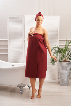 Ну кто не любит попариться в настоящей бане, или насладиться отдыхом и спа-процедурами? Если вы частая посетительница саун и бань, то вам непременно необходим этот великолепный килт банный женский. Этот набор банный заменит все для бани и сауны, при этом в комплект входит стильная чалма в подарок. Этот килт и тюрбан будут служить как халат и банная одежда для женщин, для детей и для девочек, как полотенце банное на резинке и даже как парео для пляжа. Текстиль банный вафельный - это чистый хлопок, вафельное полотно высокой плотности 240 г/м2 прекрасно впитывает влагу. Поэтому вафельные килты на резинке намного лучше впитывают влагу, чем махровый халат или полотенце и при этом он намного компактнее и занимает немного места. Килт вафельный размером 90х150 см идеально и надежно держится по фигуре. Комфортные и удобные накидка и шапочка станут вашим незаменимым спутником в бане, сауне, спа-салоне и просто в душевой спортивного клуба.