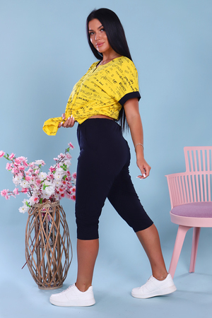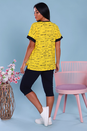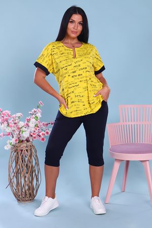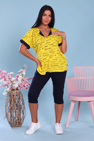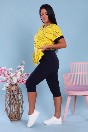 Женский костюм из 100% хлопка состоит из футболки со спущенным плечом и бриджей. Горловина футболки подчеркнута контрастной обтачкой для придания яркости фигурному вырезу. Футболка с разрезами в боковых швах, бриджи на поясе с карманами. Свободная яркая модель на каждый день подойдет для активного отдыха, прогулок на свежем воздухе.