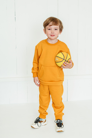 Универсальный, модный и практичный детский костюм без капюшона. Выполнен он из мягкого футера без начёса, материал приятен к телу. Костюм состоит из худи и штанов. Худи имеет карман кенгуру, для удобства надевания/снятия в размерах 80, 86 и 92 имеет на плече застежку на кнопках. На брюках есть утяжка в виде шнурка и в размерах 98, 104, 110 есть карманы. Костюм демисезонный, отлично подойдет для прогулок, в детский сад, для дома, также можно использовать в качестве спортивного костюма.