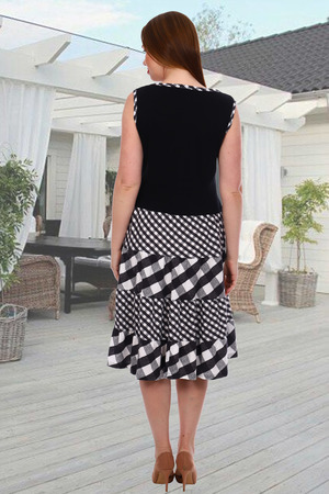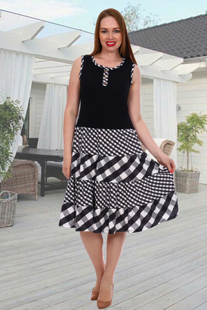 Синий летний сарафан из кулирки. Два варианта дизайна — с клетчатыми вставками и вставками с узором из огурцов, рукава отсутствуют, спереди у горловины декоративные пуговицы, общая длина чуть ниже коленей