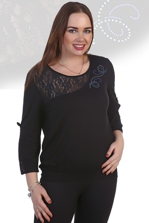 Блузка из вискозы для женщин. Кружевные вставки, рукава чуть ниже локтей, декорация из стразов, несколько вариантов расцветки. Размеры от 48 до 58. Внимание, данный товар не подбирается по цветам и не продается в розницу!
