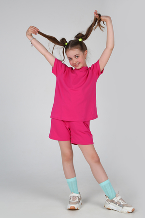 Летний хлопковый комплект для девочек - подростков в ярких тонах, состоящий из шорт и футболки.