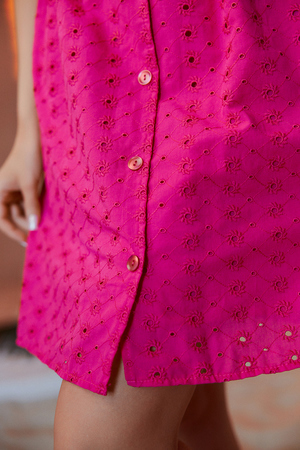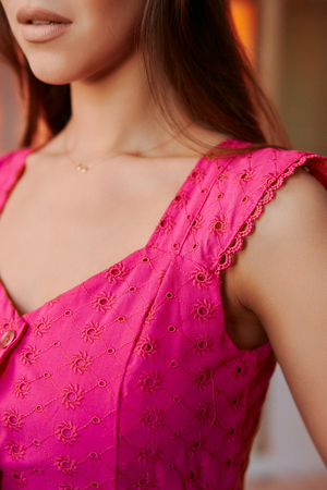 Сарафан отрезной по линии талии, расклешенный к низу, на бретелях, с V-образной горловиной спереди, длиной выше колена. Застежка на пуговицы. Внутри сарафан на хлопковой подкладке, благодаря которой верхний слой ткани не просвечивает