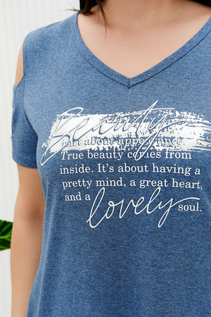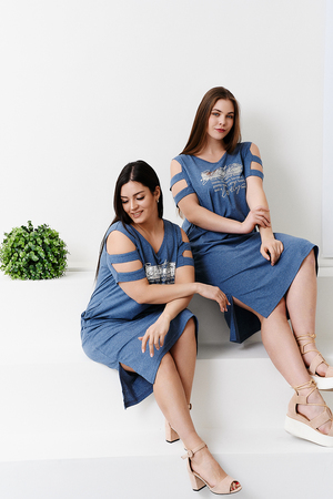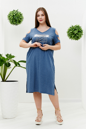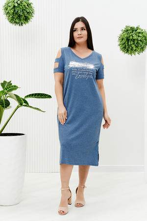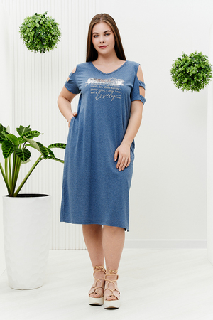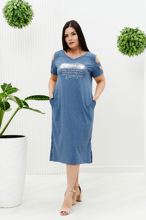 Платье женское, прямого силуэта. Вырез горловины Y-образный. На полочке принт. Рукав не цельный, два хлястика, расположенные через расстояние друг от друга, втачаны в боковые части рукава. В боковых швах внутренние карманы, внизу разрезы.