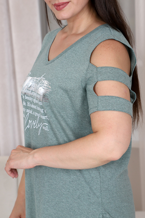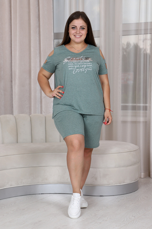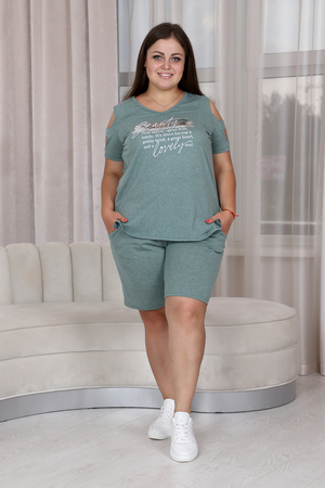 Костюм женский: туника и шорты. Туника прямого силуэта, вырез Y-образный. В боковых швах разрезы. На полочке принт. Рукав не цельный, два хлястика, расположенные через расстояние друг от друга, втачаны в боковые части рукава. Шорты свободные до колена, на передней части внутренние карманы, пояс выполнен на многоигольной машине.