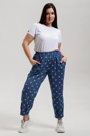 Брюки женские, "бананы", внизу передней и задней части по две встречные складки, манжеты. В брюках удобные внутренние карманы, пояс выполнен на многоигольной машине.