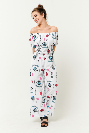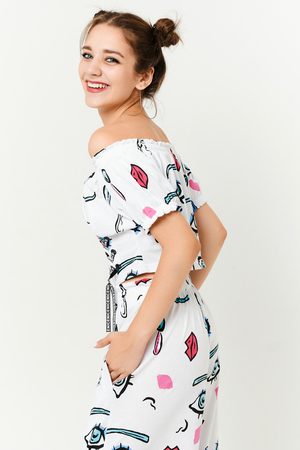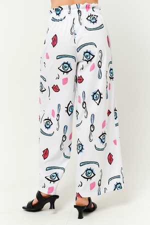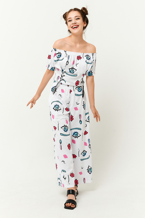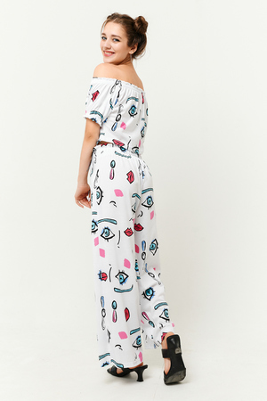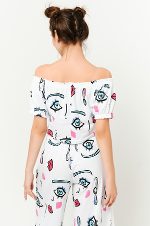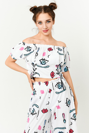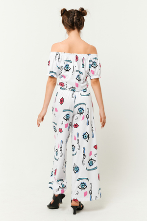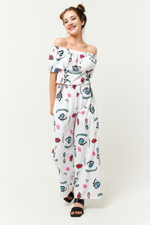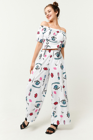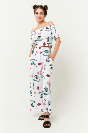 Костюм женский для летнего отдыха, состоит из укороченного топа и широких брюк с завышенной талией на широкой резинке.