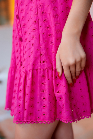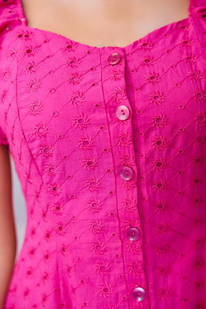 Очаровательное короткое платье из шитья. Глубокий Y-образный вырез, рукав-фонарик на эластичной ажурной тесьме. Платье приталенное, к низу расширенное. Застежка на пуговицы. Снизу оборка. Внутри сарафан на хлопковой подкладке, благодаря которой верхний слой ткани не просвечивает