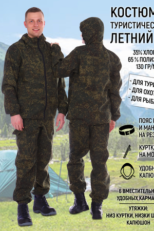 Cпецодежда универсальная летняя высокого качества и удобства. Бренд "СКЕЛА" предлагает костюм маскировочный, изготовленный из 35% натурального хлопка и 65% полиэстера. Костюм камуфляжный в сложенном виде имеет собственную многоразовую очень компактную и легкую упаковку. Хорошо сидит, не сковывает движения. Форма с длинным рукавом и широкими манжетами, состоит из куртки свободного кроя и брюк. Куртка с капюшоном, застёгивается на молнию. Брюки просторные и удобные с прорезными и накладными карманами. Пояс на эластичной резинке, что обеспечивает максимальный комфорт. Костюм представлен в камуфляжном цвете расцветки "Пиксель/цифра", которая неразличима глазом на фоне летней природы умеренной полосы. Прекрасно подойдет для охоты и рыбалки. Отличный костюм для туризма, страйкбола, пейнтбола (хорошо отстирывается) или похода в лес. Представлен широкий размерный ряд, включающий большие размеры. По стандартам для спецодежды, длина рукава измеряется от линии втачивания воротника, длина брюк от шва втачивания пояса (без учета его ширины) до низка брюк.