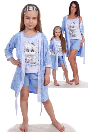 Пеньюар из кулирки для девочек из кулирки халат + майка + шорты. Халат запашной с поясом, узор в сердечко, светлые манжеты и лацканы в крапинку, длина чуть выше коленей. Светлая майка с принтом в виде котенка, узор в крапинку, окантовка в тон халата. Короткие шорты в крапинку. Несколько вариантов расцветки. Может быть парой женскому пеньюару Шоколад (продается отдельно). Размеры от 30 до 40.